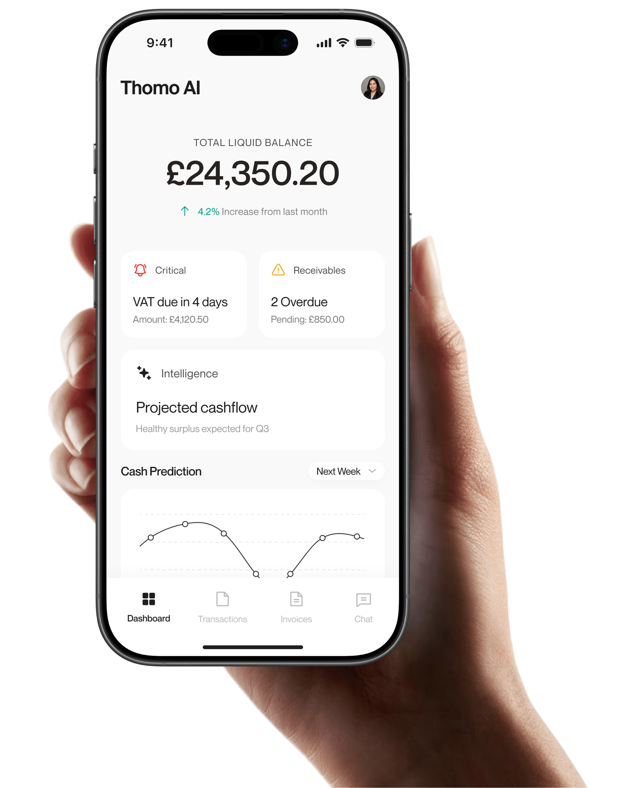 Thomo connects to your bank, predicts your cash flow 90 days out, chases invoices, and tells you exactly what to do next.